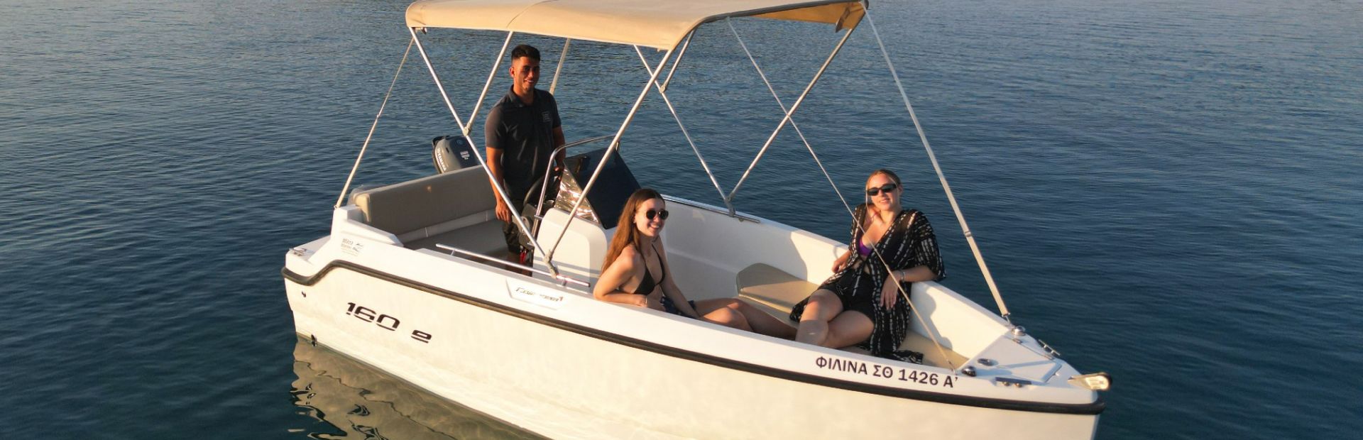 An excellent choice for anyone looking for a small open day cruise boat and very safe for kids. The 4,50 meters boat, with max capacity of 5 guests, is equipped with a super stereo with Bluetooth, a bimini tent, a swim ladder and a big cooler box. Also, it has custom position monitoring system. You can explore the island of Diaporos, Vourvourou bay and Blue Lagoon and, Sithonia coast.