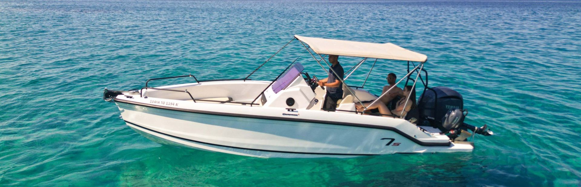 Learn MoreFor those who seek affordable luxury and adventure, “Compass 6s” is the new right choice. A speedboat with strong seaworthy identity provides to the driver high performance with a comfortable space for 7 people. Equipped with a retractable bimini, fresh shower and everything else you might need during your cruise. License is needed or we can provide you with a captain for your journey.
