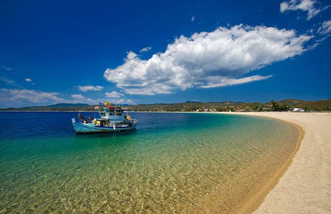 HalkidikiWhite or Myrsini Beach is a relatively small beach located on Diaporos Island in the Vourvourou area of Sithonia, the middle peninsula in Halkidiki, Greece. This beach, raechable only by boat, is known for its natural beauty, tranquil atmosphere, and clear waters. Myrsini Beach is characterized by its soft, golden sand and the surrounding lush greenery, offering visitors a serene and idyllic setting to relax and enjoy the scenery. The waters in this area tend to be calm, making it a suitable spot for swimming and snorkeling. The shallow and clear sea makes it appealing for families with children as well. The beach is surrounded by stunning landscapes and is part of the broader Vourvourou region, known for its beautiful coastline, numerous small islands, and clear waters.