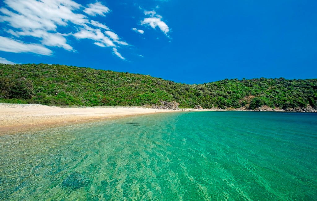 HalkidikiWhite or Myrsini Beach is a relatively small beach located on Diaporos Island in the Vourvourou area of Sithonia, the middle peninsula in Halkidiki, Greece. This beach, raechable only by boat, is known for its natural beauty, tranquil atmosphere, and clear waters. Myrsini Beach is characterized by its soft, golden sand and the surrounding lush greenery, offering visitors a serene and idyllic setting to relax and enjoy the scenery. The waters in this area tend to be calm, making it a suitable spot for swimming and snorkeling. The shallow and clear sea makes it appealing for families with children as well. The beach is surrounded by stunning landscapes and is part of the broader Vourvourou region, known for its beautiful coastline, numerous small islands, and clear waters.